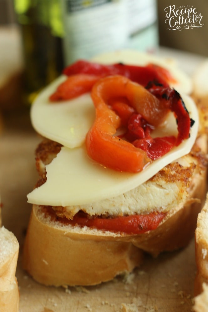 - Build panini sandwiches: Onto one slice of bread, spread 2 tbsp marinara sauce. Top with sliced chicken, a slice of provolone, a little more sauce, and a few red bell pepper strips. Top with other slice of bread. Drizzle both sides with a little olive oil.