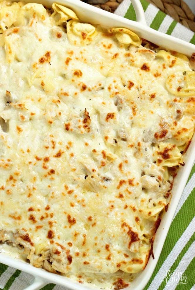 - In a casserole dish, layer half of the tortellini pasta( no precooking required). Top with 1 1/2 cups rotisserie chicken, 1 cup shredded mozzarella, half of the cream mixture. Repeat layers once more. Top with remaining mozzarella.