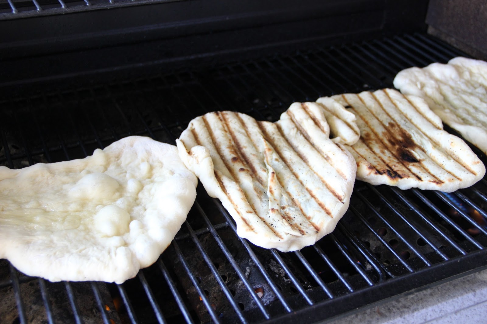 Heat grill to high. Split dough into 4 equal portions. On a floured surface, roll and stretch out for individual pizzas. These are very rustic, don’t worry if they are not round. Brush sides of dough with olive oil and sprinkle one side with salt and pepper. Quickly and carefully transfer them to grill. Grill 2 to 3 minutes until golden and flip and grill another 1 or 2 minutes.