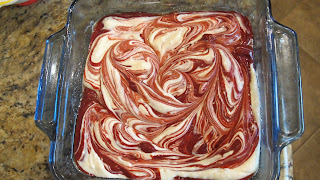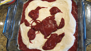 For the cream cheese layer, blend all of the ingredients and pour over the brownie layer like so: