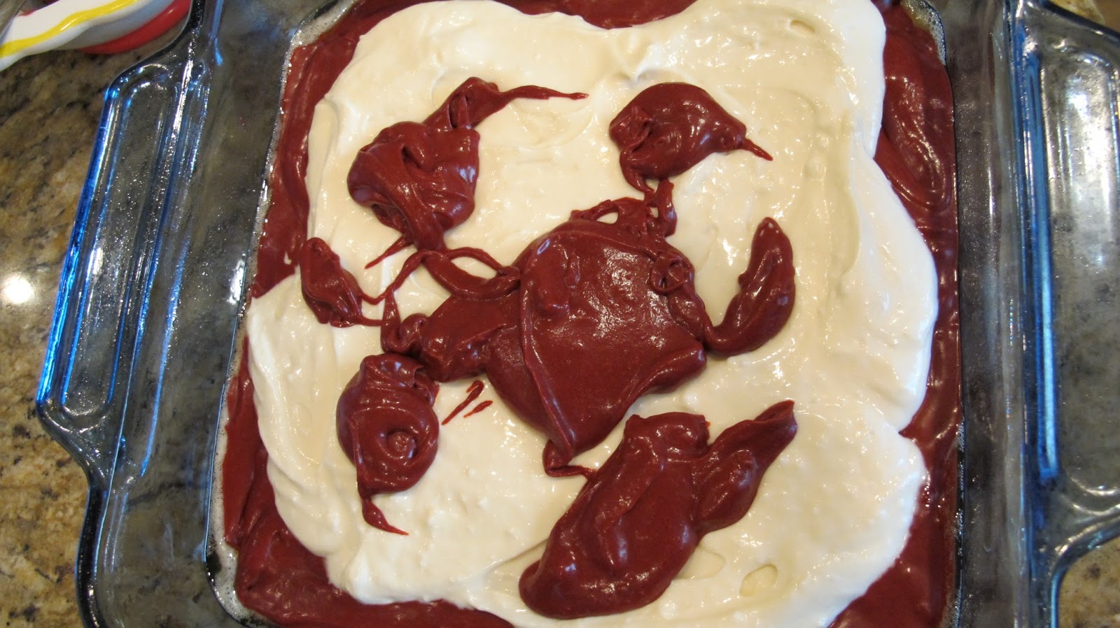 Spray or butter an 8 x 8 baking dish. Preheat oven to 350 degrees. For brownie layer, melt 1 stick butter. Mix the melted butter with sugar, vanilla, 1/4 cup of cocoa powder, salt, food coloring, and vinegar in that order, mixing in between each. Whisk eggs and add to cocoa mixture. Fold in flour followed by nuts. Pour into baking dish reserving about 1/4 cup.